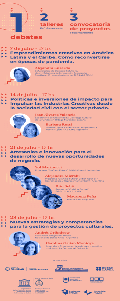 Invitan a participar de la primera instancia: el ciclo de debates con especialistas, nacionales e internacionales, con el objetivo de reflexionar, a través de diferentes temas y en conjunto, sobre nuevas estrategias y competencias para un mayor y mejor desarrollo y profesionalización del sector que conforman las industrias creativas.