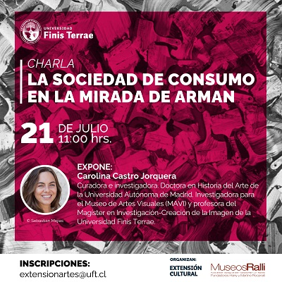 En esta oportunidad “La sociedad de consumo en la mirada de Arman” está programada para el día miércoles 21 julio de 2021 a las 11:00 horas (Chile) y estará a cargo de la destacada curadora e investigadora, Doctora en Historia del Arte en Universidad Autónoma de Madrid (España) y docente de la Universidad Finis Terrae: Carolina Castro Jorquera, quien analizará la obra del artista franco-estadounidense Armand Pierre Fernández (1928-2005) más conocido como Arman. Sus instalaciones a gran escala, en base a enormes acumulaciones de objetos, lo sitúan en el movimiento Nouveau Réalisme (Nuevo Realismo), lo transformaron en uno de los creadores más innovadores de su tiempo y hoy son una referencia para reprensar la actual sociedad de consumo, y el rol del arte en el presente.