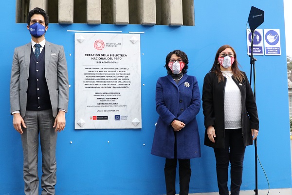 Con la develación de una placa del Bicentenario, el 28 de agosto, el Estado peruano, a través del Proyecto Especial Bicentenario, conmemoró los dos siglos de vida institucional de la Biblioteca Nacional del Perú (BNP). La ceremonia realizada en la sede de San Borja contó con la presencia de Leslie Urteaga, viceministra de Patrimonio Cultural e Industrias Culturales del Ministerio de Cultura; Laura Martinez, directora ejecutiva del Proyecto Especial Bicentenario; y Ezio Neyra, jefe institucional de la BNP.