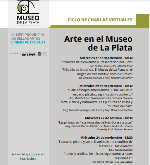El 1º de septiembre a las 18:30 comenzará el Ciclo de charlas virtuales organizado por el Museo de La Plata, el Instituto de Historia del Arte Argentino y Americano (IHAAA) de la Facultad de Artes y el Museo provincial de Bellas Artes Emilio Pettoruti.