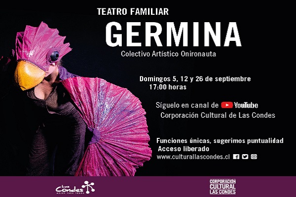 GERMINA. Teatro infantil online. Domingos 5, 12 y 26 de septiembre, 17:00 horas. www.culturallascondes.cl / Canal YouTube Corporación Cultural de Las Condes. ACCESO LIBERADO