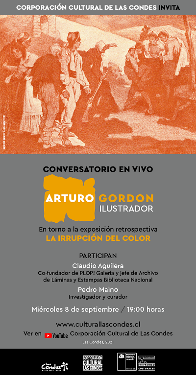 En el marco de la exposición retrospectiva ARTURO GORDON, LA IRRUPCIÓN DEL COLOR, que la Corporación Cultural de Las Condespresenta en su sitio web hasta fines de septiembre, se realizará también en forma online un Conversatorio en Vivo el miércoles 8 de septiembre, a las 19:00 horas. En la oportunidad participarán Pedro Maino, investigador y curador, y Claudio Aguilera, periodista, escritor e investigador de la ilustración chilena, como cofundador de PLOP! Galería y jefe del Archivo de Láminas y Estampas de la Biblioteca Nacional, quienes abordarán la fructífera labor como ilustrador que Arturo Gordon inició en 1910.