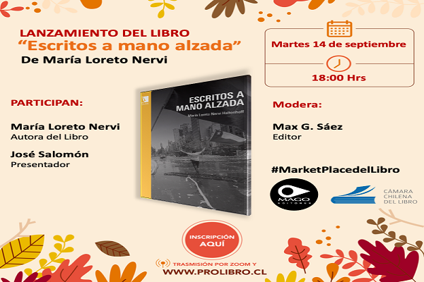 La Cámara Chilena del Libro y Mago Editores invitan al lanzamiento del libro “Escritos a mano alzada”, de María Loreto Nervi, este martes 14 de septiembre a las 18:00 horas, encuentro que será transmitido a través de Zoom y Prolibro.cl