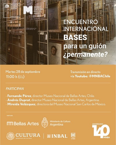 Como parte de las actividades para culminar la celebración del 140 aniversario del Museo Nacional de Bellas Artes, les invitamos al Encuentro Internacional. Bases para un guión ¿permanente?, que se realizará el martes 28 de septiembre a las 11:00h (CL), vía Youtube: @MNBAChile.