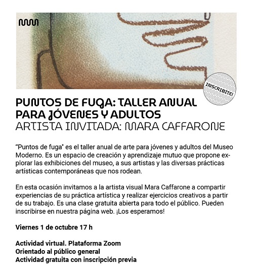 “Puntos de fuga” es el taller anual de arte para jóvenes y adultos del Museo Moderno. Es un espacio de creación y aprendizaje mutuo que propone explorar las exhibiciones del museo, a sus artistas y las diversas prácticas artísticas contemporáneas que nos rodean.