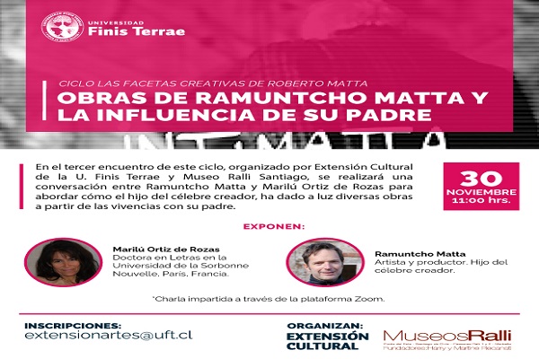3° encuentro: martes 30/11/2021 a las 11:00 horas #Chile | Marilú Ortiz de Rozas conversará con Ramuntcho Matta, artista, productor e hijo del célebre creador, sobre sus obras a partir de las vivencias con Matta: “Intimatta”, Matta. Cartas a Ramuntcho”, “Mattascopio”, entre otras.