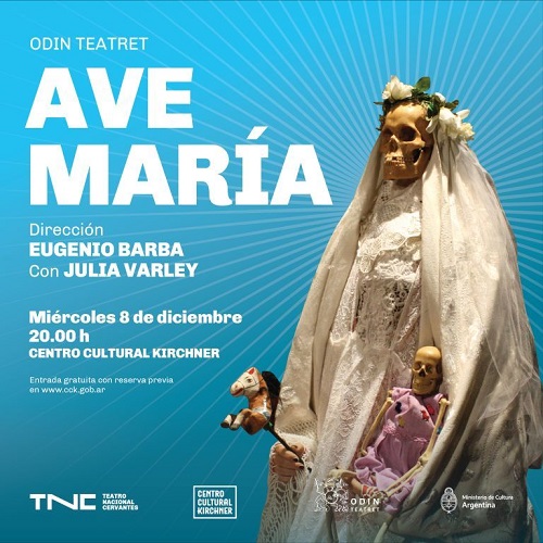 El Teatro Nacional Cervantes en coproducción con el Centro Cultural Kirchner y el Odin Teatret realizarán una única función del espectáculo Ave María en la Sala Argentina de El Kirchner el miércoles 8 de diciembre a las 20 h. Las entradas son gratuitas y se reservan a través de la web del Centro Cultural Kirchner desde el viernes 3 a las 12 h.