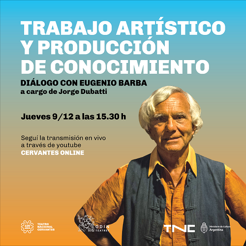 Eugenio Barba se presentará en diálogo por streaming junto a Jorge Dubatti, el jueves 9 de diciembre a las 15:30 h desde el Teatro Nacional Cervantes. La transmisión en vivo estará disponible en el Cervantes Online.