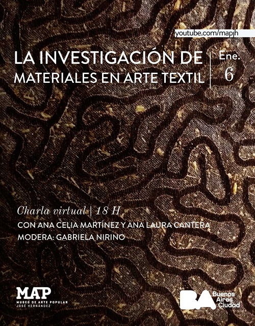 Jueves 6 de enero a las 18:00. La investigación de materiales en el arte textil. Contrapunto entre Ana Celia Martínez y Ana Laura Cantera. Las artistas textiles e investigadoras contarán su experiencia trabajando con materiales no convencionales. Modera: Gabriela Nirino.