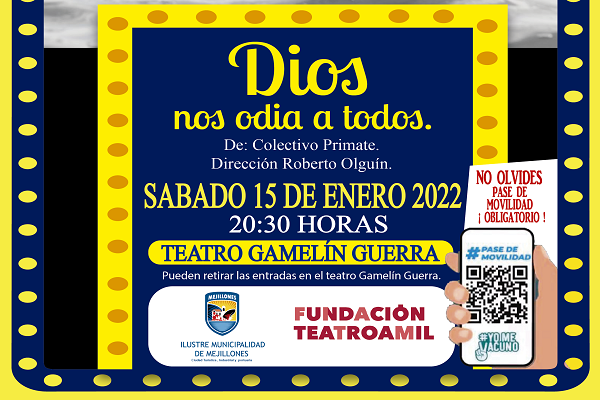 Destacamos además, que Dios nos odia a todos se enmarca en el festival nacional Teatro a Mil – Territorios creativos quienes destinaron 100 entradas para nuestra comuna las cuales se encuentran a disposición en el teatro Gamelín Guerra. Recuerda, esta es solo la invitación, debes solicitar tu entrada haciendo previa declaración de contar con pase de movilidad.