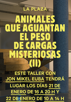 TEA oferta un nuevo taller del programa La Plaza que estará a cargo del artista Jon Mikel Euba. Animales que aguantan el peso de cargas misteriosas II es el título de esta nueva acción que tendrá lugar el viernes 21, de 16:00 a 20:00 horas, y el sábado 22, de 10:00 a 14:00 horas. Inscripciones en laplaza.tallerestea@gmail.