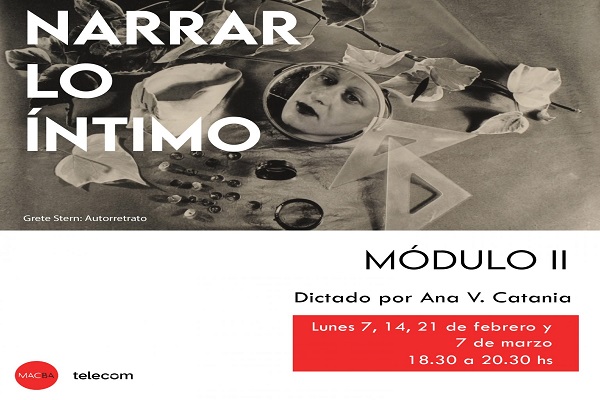 TALLER DE LECTURA: NARRAR LO ÍNTIMO – MÓDULO II. Dictado por Ana V. Catania. Días: lunes 7, 14, 21 de febrero y 7 de marzo. Horario: 18.30 a 20.30 hs. Costo: $4000 Modalidad: Educación online por Zoom. Se entrega certificado de asistencia