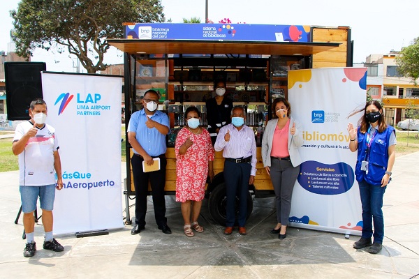 La ceremonia de presentación del Bibliomóvil en el Callao contó con la participación de la jefa institucional de la BNP, Fabiola Vergara; la coordinadora de la Gran Biblioteca Pública de Lima, Liubenka Obrenovich; la gerente de Sostenibilidad de LAP, Julissa Salavarría Moreno; y el secretario general de la comunidad Aeropuerto. Aquiles Meza.