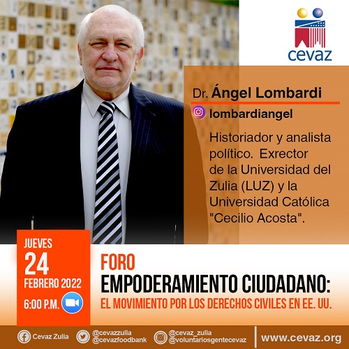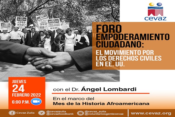 El Centro Venezolano Americano del Zulia (CEVAZ) se complace en invitarles al Foro «Empoderamiento Ciudadano: El Movimiento por los Derechos Civiles en EE. UU.» evento que se realizará en el marco del Mes de la Historia Afrodescendiente, con Dr. Angel Lombardi, historiador y analista político; exrector de la Universidad Católica Cecilio Acosta (UNICA) y de La Universidad del Zulia (LUZ).