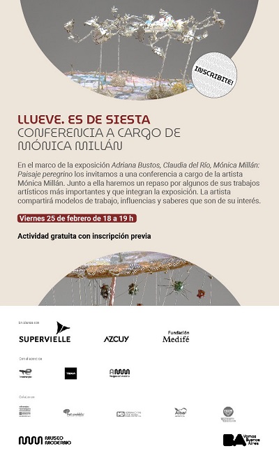 En el marco de la exposición Adriana Bustos, Claudia del Río, Mónica Millán: Paisaje peregrino los invitamos a una conferencia a cargo de la artista Mónica Millán. Junto a ella haremos un repaso por algunos de sus trabajos artísticos más importantes y que integran la exposición. La artista compartirá modelos de trabajo, influencias y saberes que son de su interés.