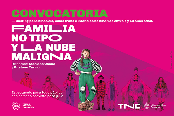 El Teatro Nacional Cervantes convoca a participar del casting de preselección a niñas cis, niñas trans e infancias no binarias entre 7 y 10 años de edad para Familia no tipo y la nube maligna, dirigida por Mariana Chaud y Gustavo Tarrío, obra a estrenarse en julio en la Sala María Guerrero.