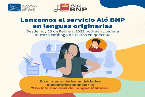 De la misma manera, implementó el servicio de lectura telefónica «Aló, BNP» en lenguas originarias, mediante el cual, un equipo de 23 voluntarios (as) lee diversas lecturas en tres variantes del quecha: quechua chanka, quechua Cusco collao y quechua Áncash central. A la fecha, se han atendido 15 solicitudes de Junín, Cerro de Pasco y Lima.