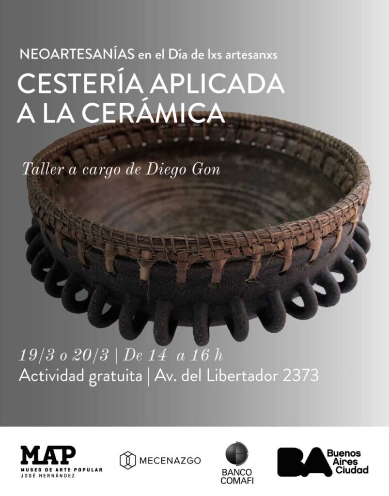El evento tendrá una variada grilla de actividades gratuitas y para todo tipo de público: desde familias hasta jóvenes emprendedores. El sábado 19 de marzo de 14 a 16 horas se realizará el Taller de cestería aplicada a la cerámica por Diego Gon. Actividad gratuita con cupos limitados e inscripción previa en infomap@buenosaires.gob.ar. A las 16, habrá Demostraciones en simultáneo de artesanxs: Marta Villarreal de la ciudad de Córdoba realizará piezas en pet en el mismo momento en que las artesanas Graciela Gómez y Juana Patricia Gómez de Copacabana (Córdoba) harán las suyas en palma. Por otro lado, el artesano Guillermo Silpituca realizará piezas en cerámica con su impresora 3d, algo novedoso y original para el público.