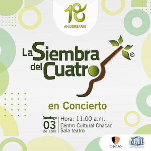 La cita para La Siembra del cuatro en concierto es el próximo domingo 3 de abril a las 11:00 a.m. Los boletos pueden adquirirse en www.liveri.com.ve o en las taquillas del Centro Cultural Chacao, en El Rosal.