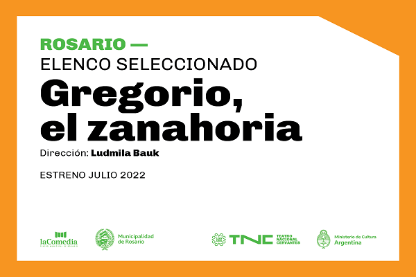 Manuel Baella, Cecilia Li Causi, David Gastelú, Marisa Rinaldi y Nicolás Carlos Terzaghi fueron seleccionadxs para formar parte del elenco de Gregorio, el zanahoria dirigida por Ludmila Bauk, entre lxs 250 artistas que participaron de la convocatoria abierta a casting que realizaron en conjunto el Teatro Nacional Cervantes y el Teatro Municipal La Comedia de Rosario destinada a actores y actrices radicadxs en el Gran Rosario.